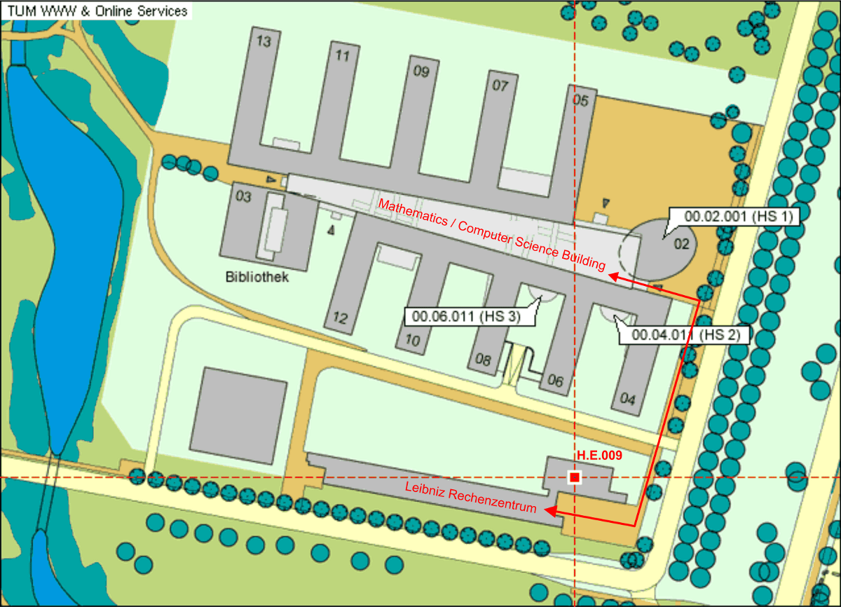 The conference venue at Garching campus can best be reached by subway. You need to take subway line U6 (blue line) to "Garching Forschungszentrum" (final stop), the travel time from Marienplatz (city center) is about 25 minutes. Exit the train and follow the signs to "Leibniz Rechenzentrum". See the MVV website (local transport authority) for details and an online route planner.