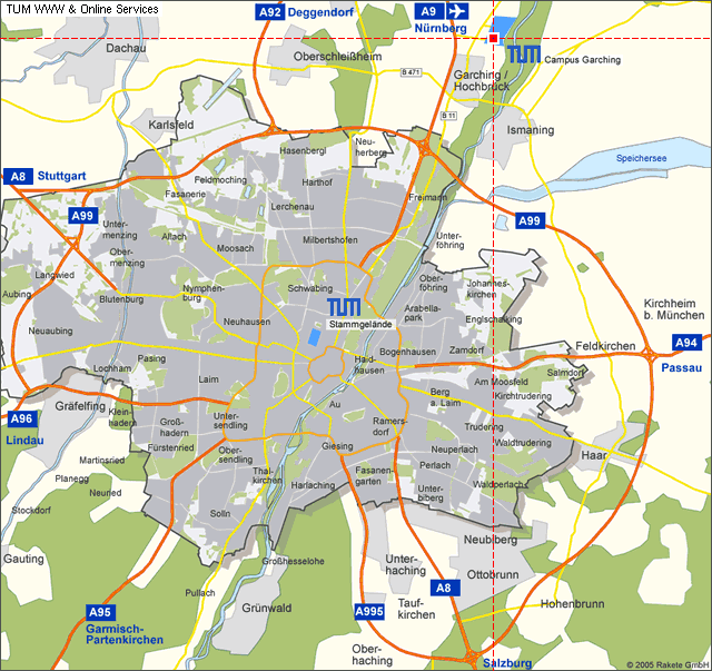 - From Munich (north or city center): Take subway line U6 to "Garching Forschungszentrum" (final stop). Coming from city center, you might have to first take another subway line and change later to U6.
